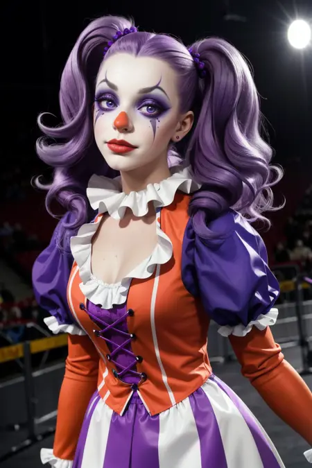 클로우너 복장을 하고 있으며 매우 길고 자주색 머리카락을 가짐,