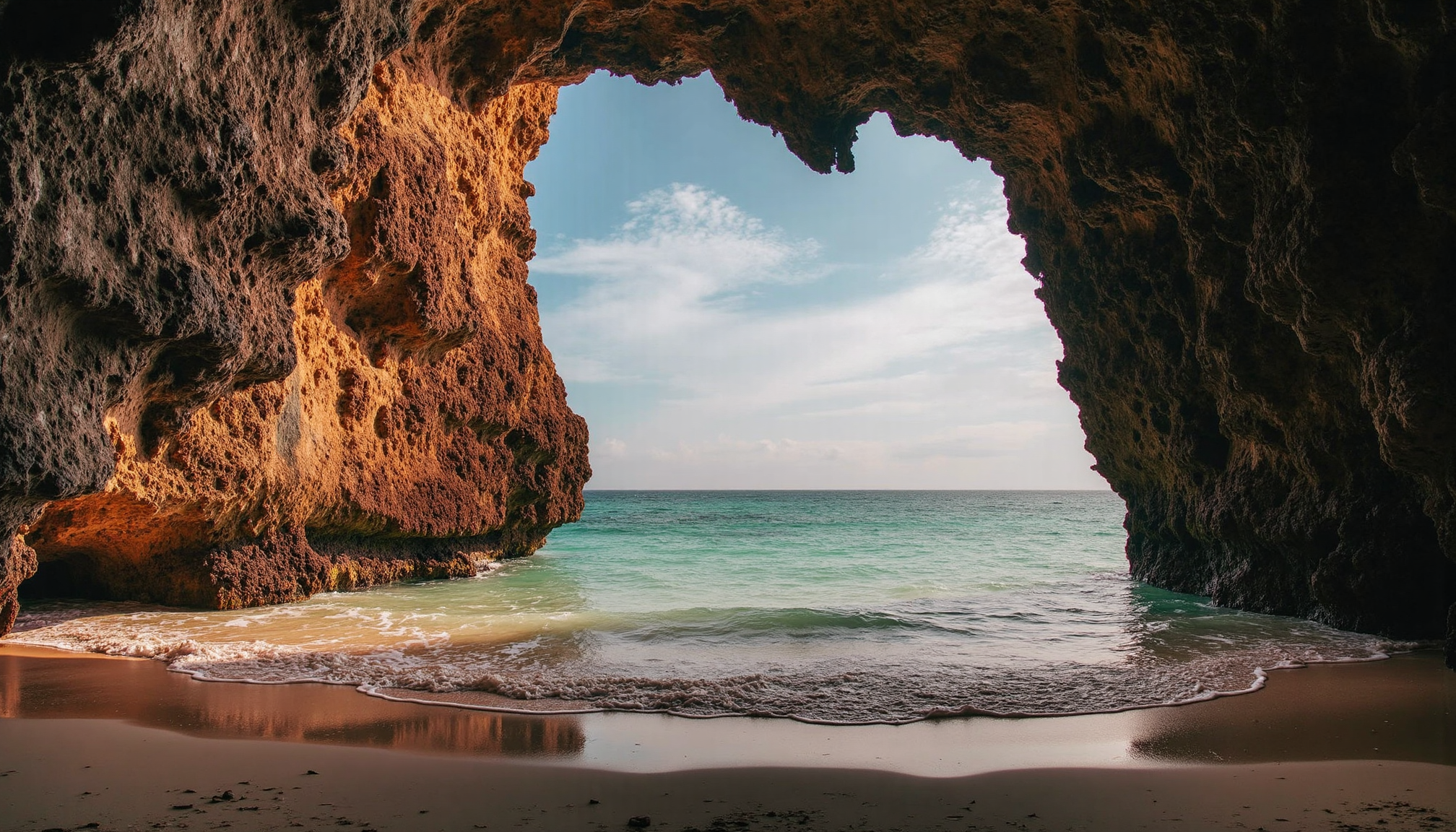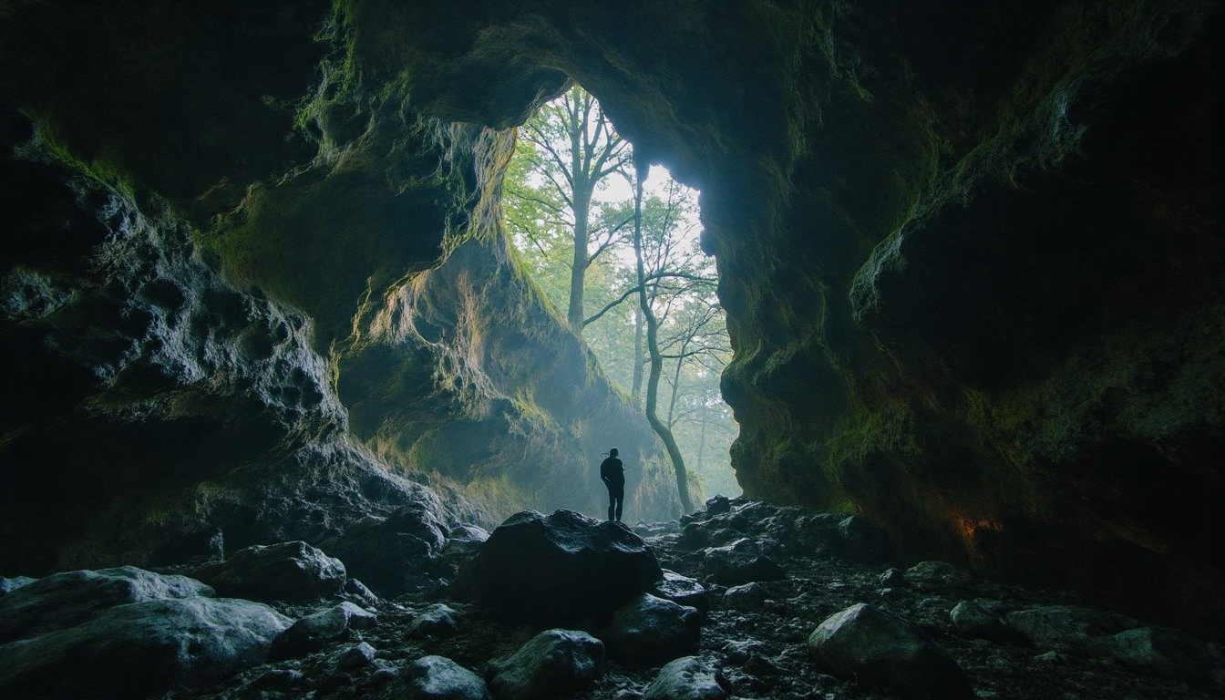 "c4ve, 一个黑暗而多雾的洞穴,通向美丽的日落"