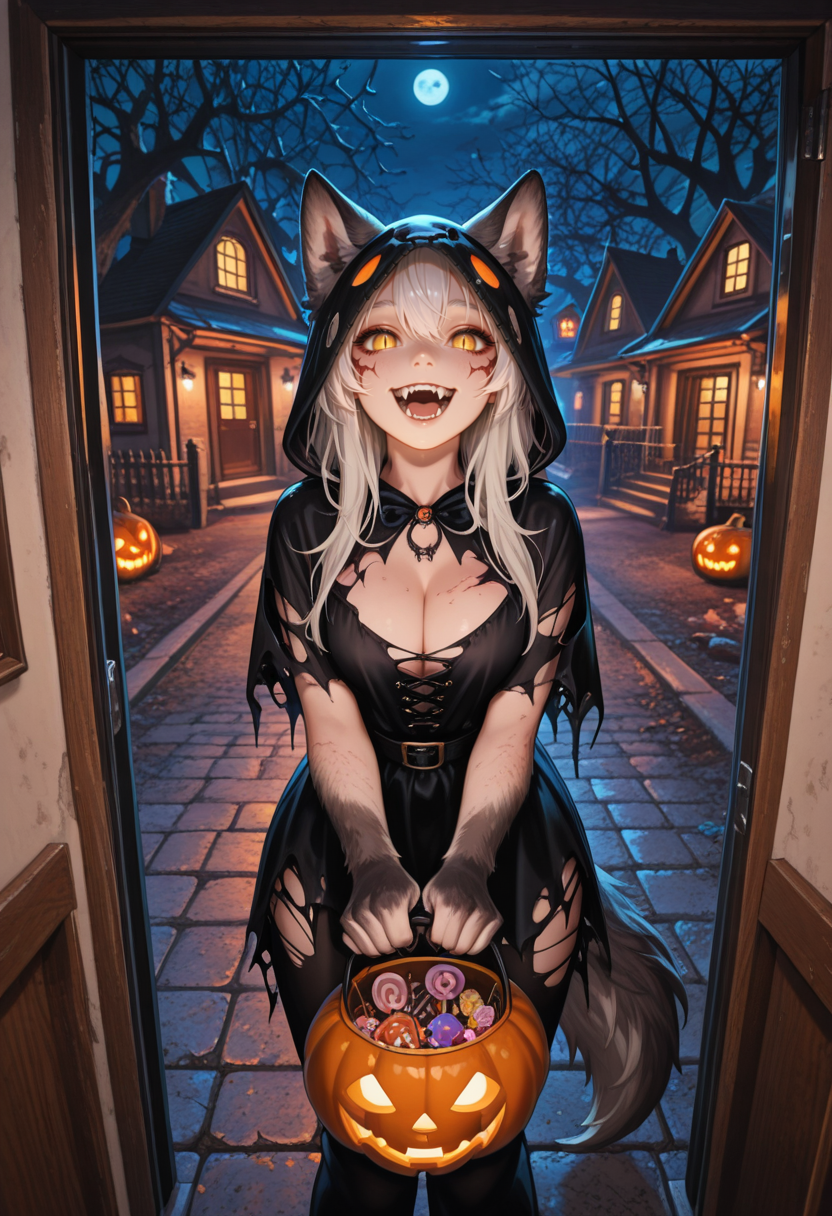 tr1ck0rtr3at, doorway, trick or treat, town, candies, night, halloween, holding halloween bucket,