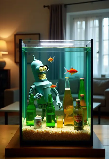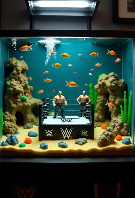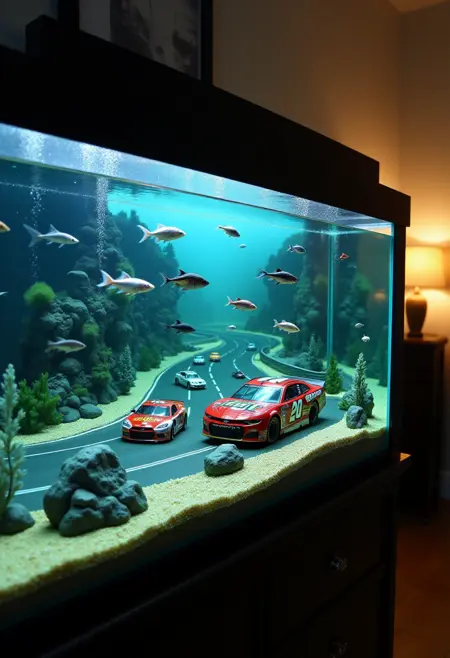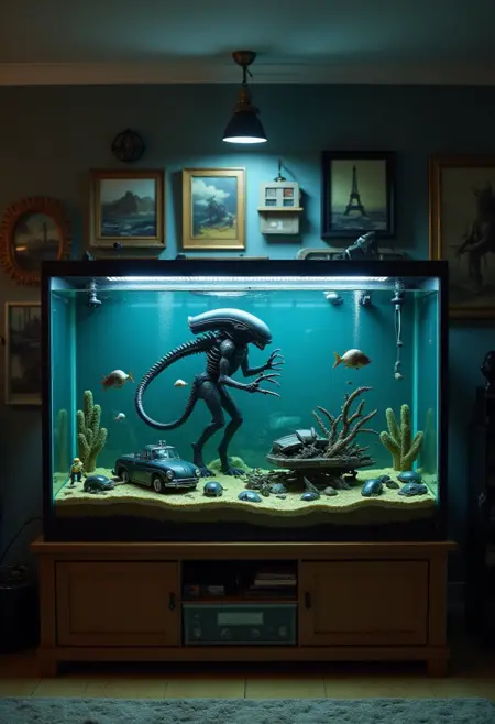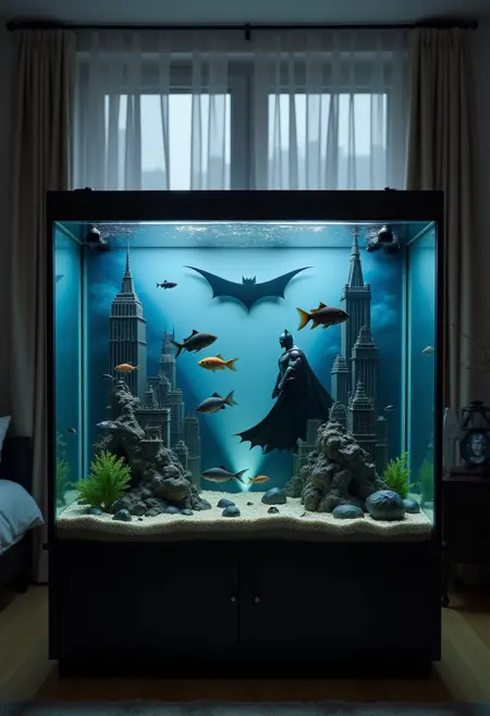 - 这张图是一张高度详细的摄影作品,描绘了一个被设计成(主题)样式的水族箱,水族箱位于(地点)。