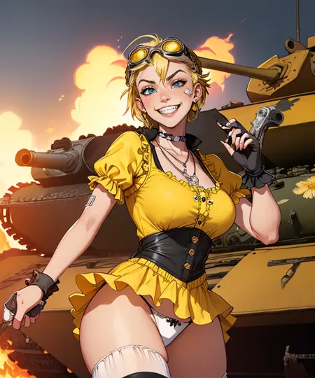 옐로우 플로럴 셔츠 프롬프트 도우미: TanKGirlYellowFloral, yellow_shirt, yellow_floral_pattern, yellow_floral_print, white_frills, white_trim, frilly_trim, frilly_neckline_trim, short_sleeves, Juliette_sleeves, black_panties, side_tie_panties, black_fingerless_gloves,