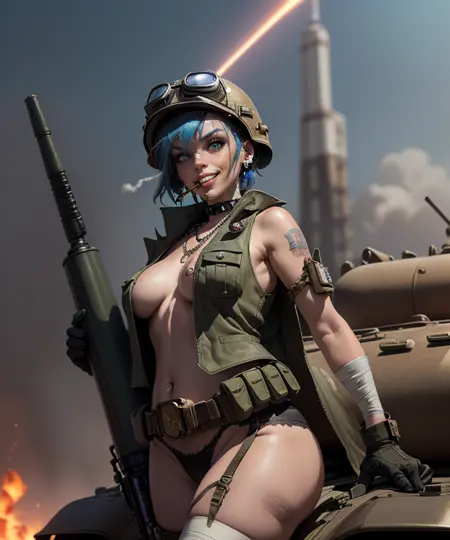 (이건 제게 매우 실망스러운 결과입니다. 미사일 브라는 탱크 걸의 가장 인상 깊은 상징적 외모 중 하나이기 때문입니다. 아무리 프롬프트를 강화해도 이건 오직 배경에 미사일을 추가할 뿐입니다. 향후 미사일 브라 전용 LoRA를 따로 제작할 가능성이 높습니다.)