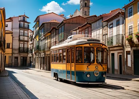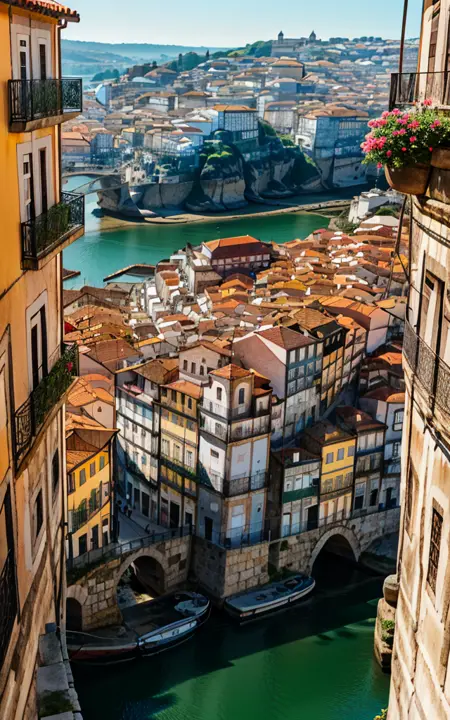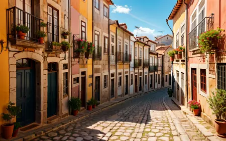 南ヨーロッパのポルトガルの街の風景、色とりどりの家と赤い瓦、青空、海