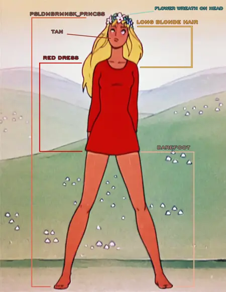 tan, long blonde hair,red dress - Внешность Принцессы из второго мультфильма