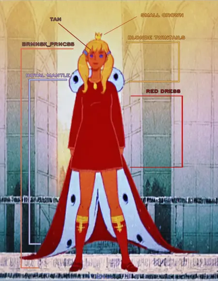 small crown, royal mantle, red boots - опциональные дополнительные акссуары к внешности Принцессы из первого мультфильма