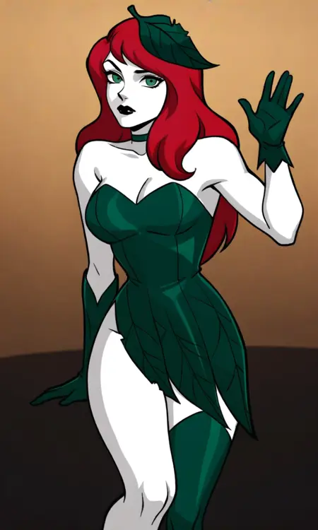 1girl,long hair,red hair,leaf hair ornament,white skin,pale skin,green eyes,black lips,green choker,green dress,asymmetrical dress,short dress,strapless dress,single thighhigh,green thighhigh,green gloves