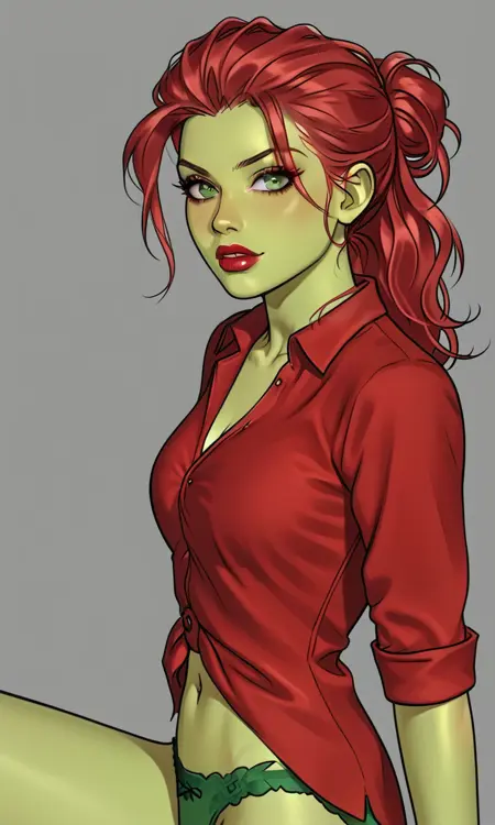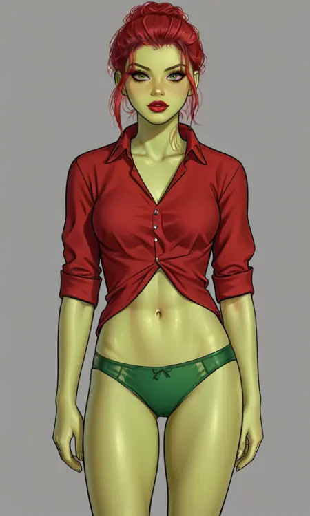 1woman,green skin,green eyes,green leavy panties,red hair,red shirt