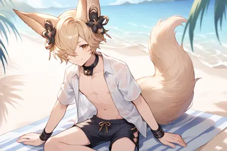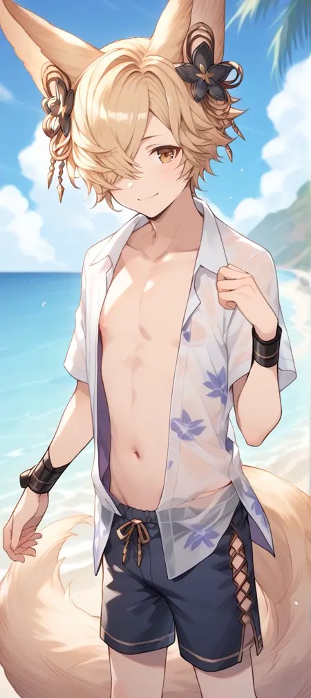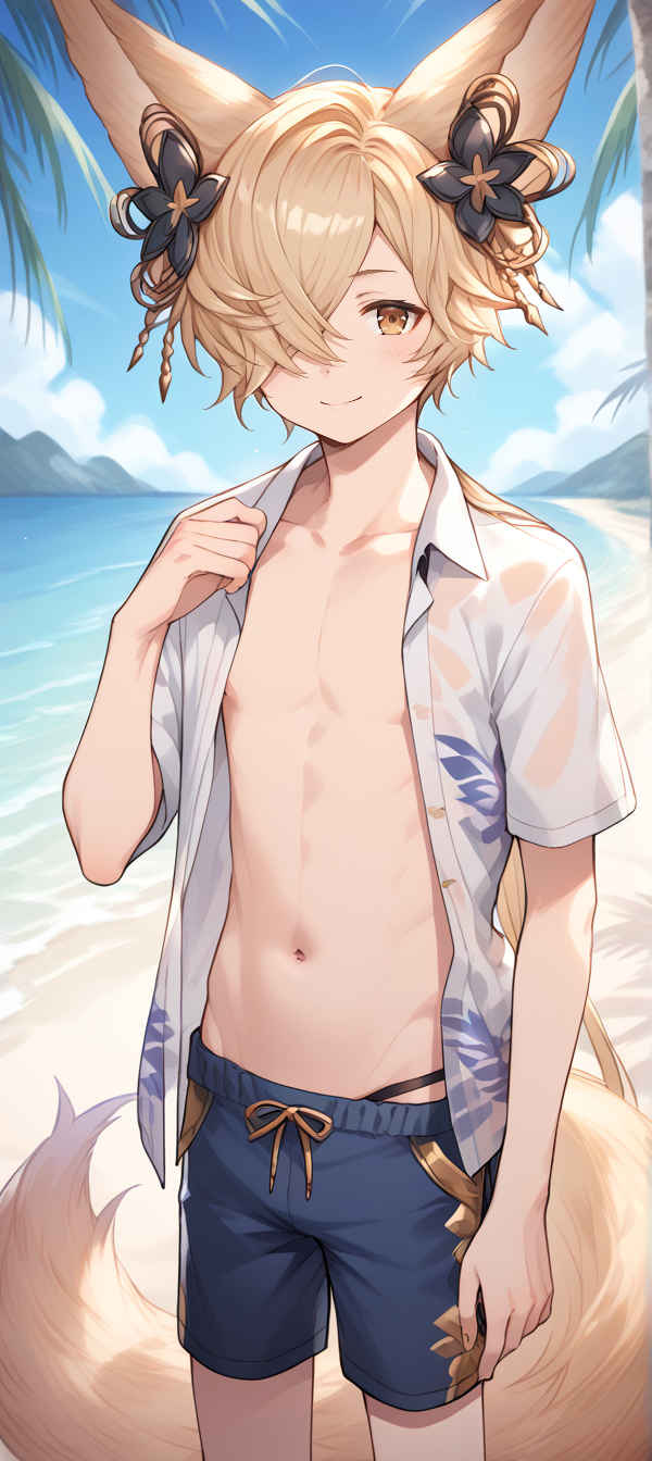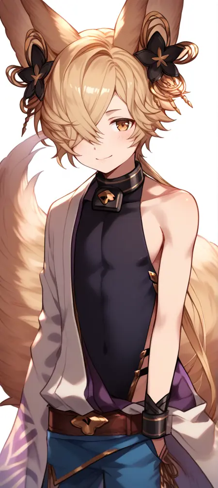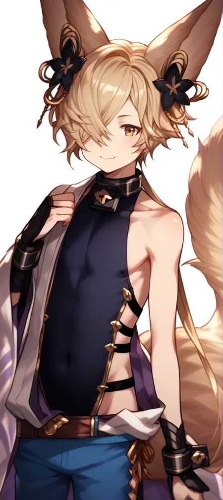 触发词:kou(格兰蒂亚)、动物耳朵、狐狸耳朵、尾巴、发饰、狐狸尾、erune、头发遮住一只眼睛、无背服装、金色头发、黄色眼睛
