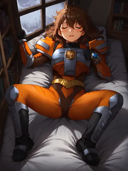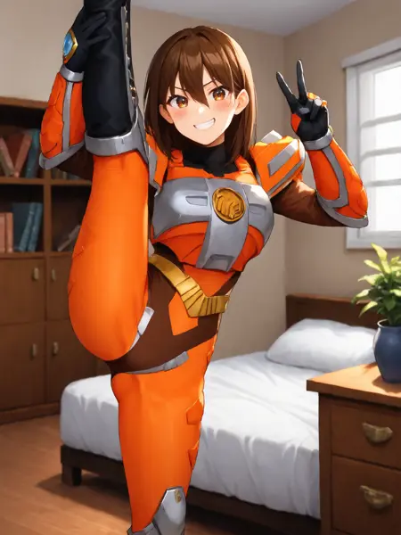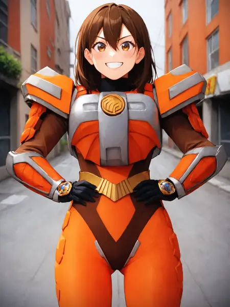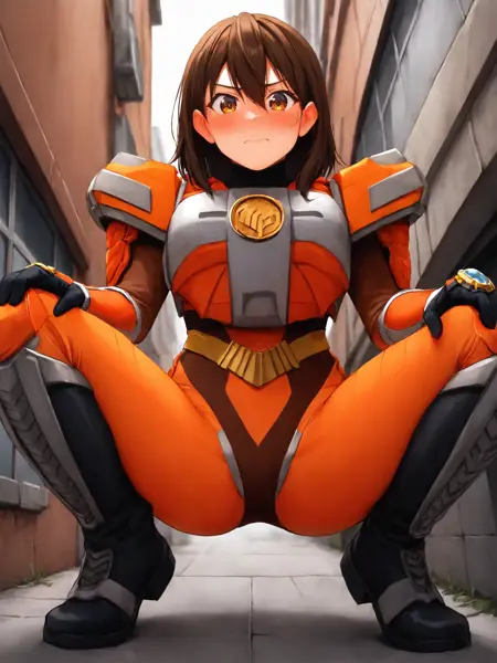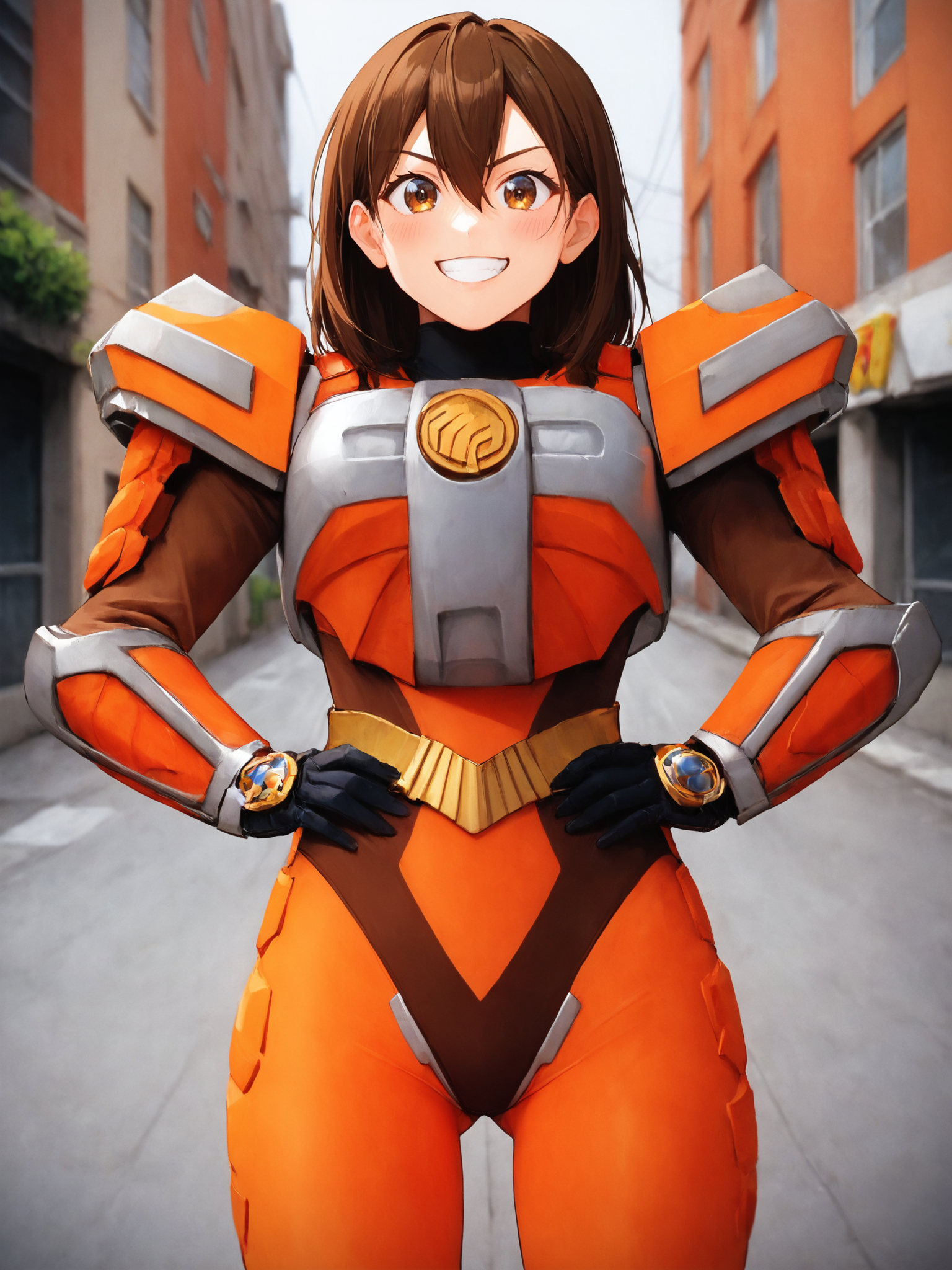 sazervisuel, orange bodysuit, brown leotard, belt, armor, gauntlets, black gloves