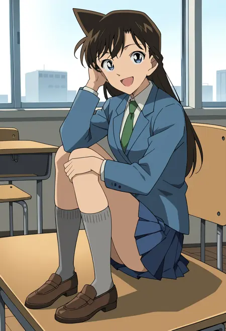 学校制服用推奨キーワード: 青いジャケット、緑のネクタイ、白いシャツ、青いプリーツスカート、灰色の靴下、茶色の靴