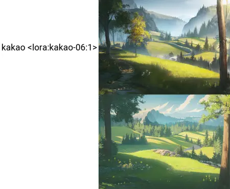 让我感到惊喜的是,生成的风景图具有一定的超现实感,且远比仅使用 AOM3 时更少千篇一律。你可以在上方看到同一提示词在使用与不使用 LoRA 时的四张对比图像。