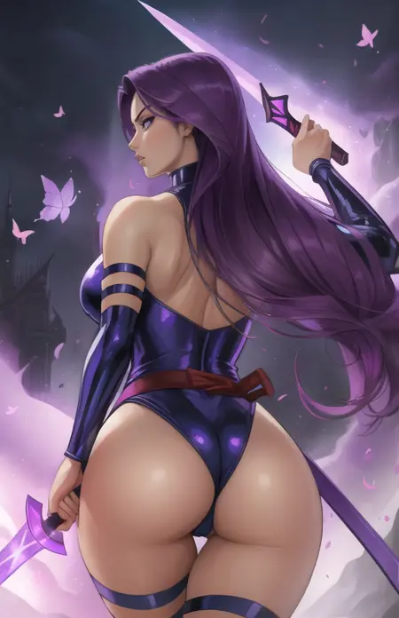 그녀의 심리적 나이프와 칼은 기술적으로 포함되어 있지만, AI는 무기를 잘 처리하지 못합니다. "에너지 칼날", "단도", 또는 "-purple 불꽃" 같은 표현을 사용해 안내해 보는 것도 가능하지만 완벽을 기대하긴 어렵습니다. 다른 무기 LoRA와 실험해 보시는 것도 추천합니다.