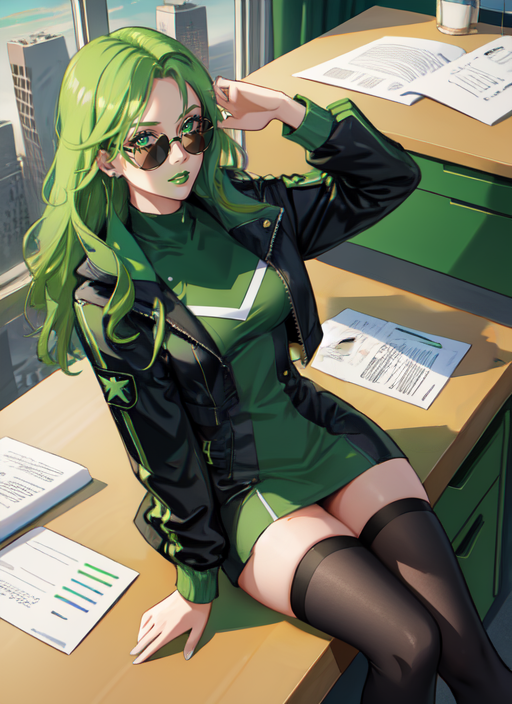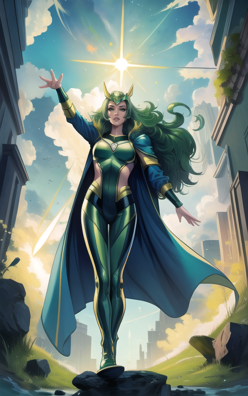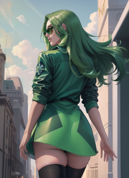 最佳使用强度为 0.6 - 1。激活标签为“Polaris”后接“连体衣、头盔、披风”,用于她的标准英雄装束;或使用“短夹克、衬衫连衣裙、长筒袜、太阳镜”(建议在负面提示中加入英雄装束描述)用于她目前的克罗科亚造型。