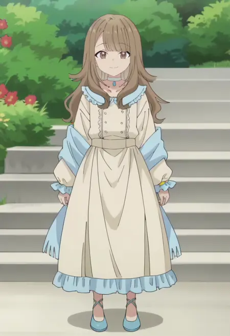 衣装1:チョーカー、長袖、鎖骨、ショール、フリル、白いドレス