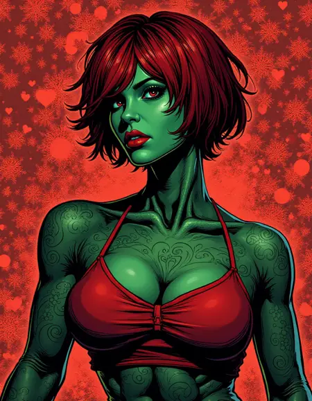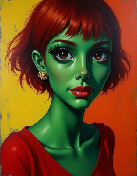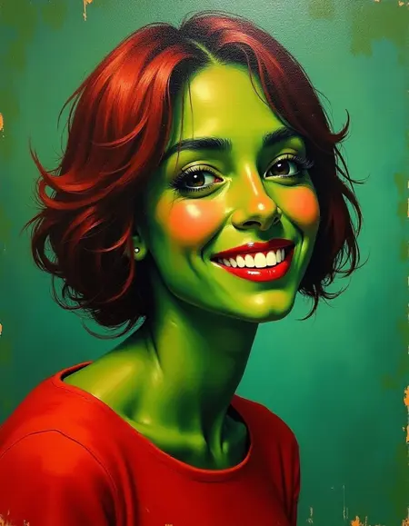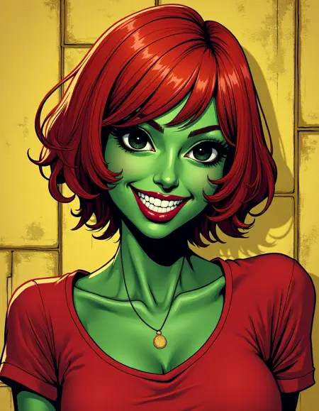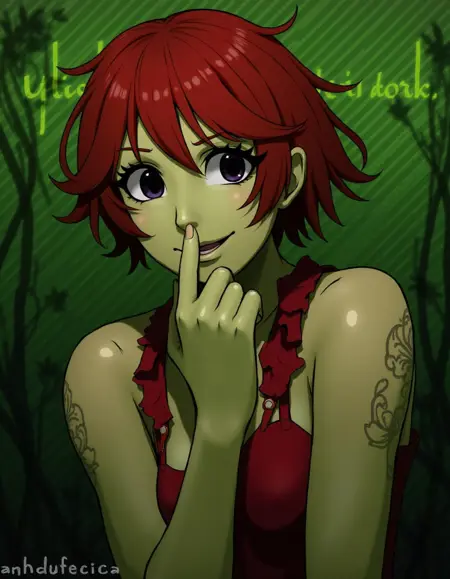 1woman, ((green skin)), ((black sclera)), black eyes, short hair, (red hair), red top