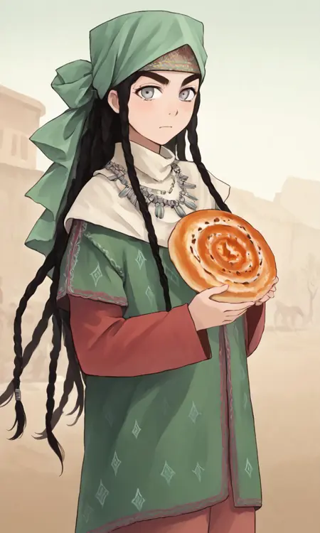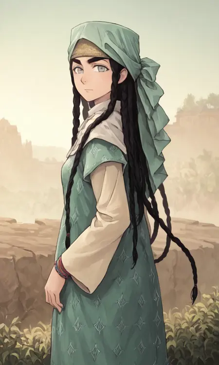 pariyaotoyomegatari, long hair, black hair, multiple braids, thick eyebrows, grey eyes