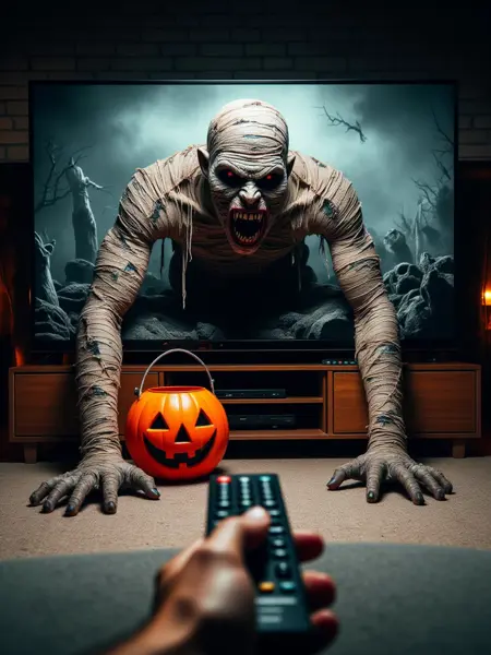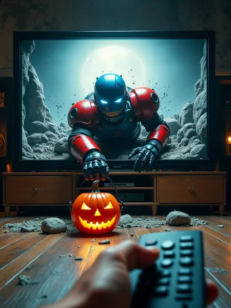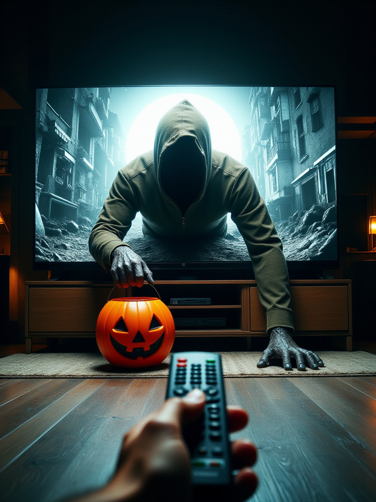 从大型电视机屏幕中爬出的手持遥控器,同时拿着南瓜桶。双手摊开在地板上,从电视机中浮现。