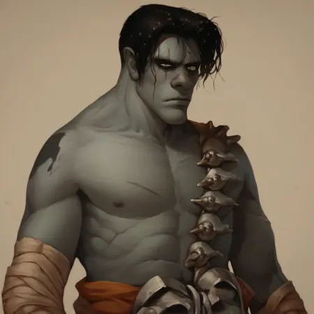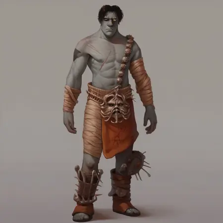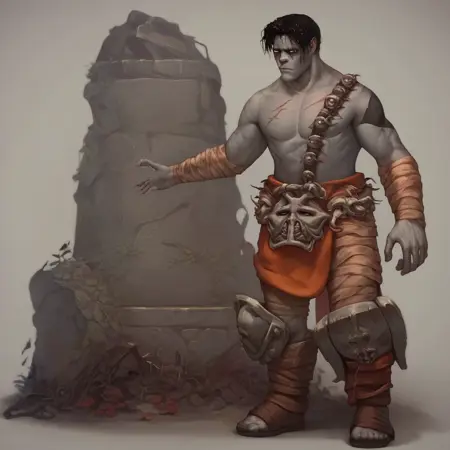 undead, zombie, grey skin, black hair, dried skin, male Focus, solo, bandages, skuill, scar, full body, topless male