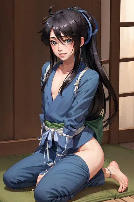 트리거 + 외모: nasu no yoichi, otoko no ko, long hair, ponytail, hair ribbon
