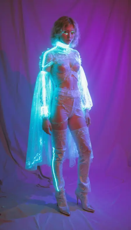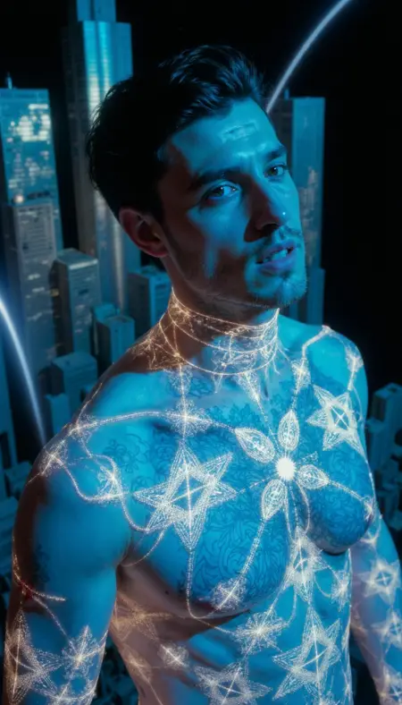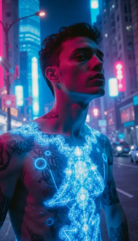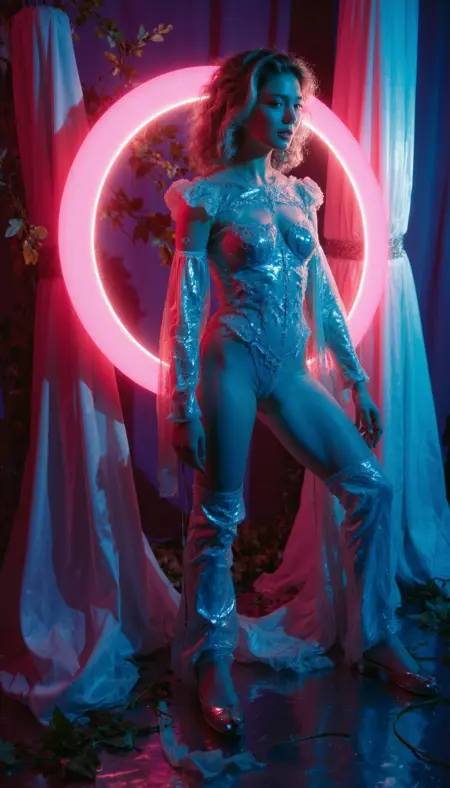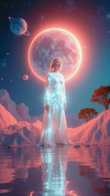 네온 빛과 빛나는 구름 같은 우주적이고 초현실적인 요소 포함