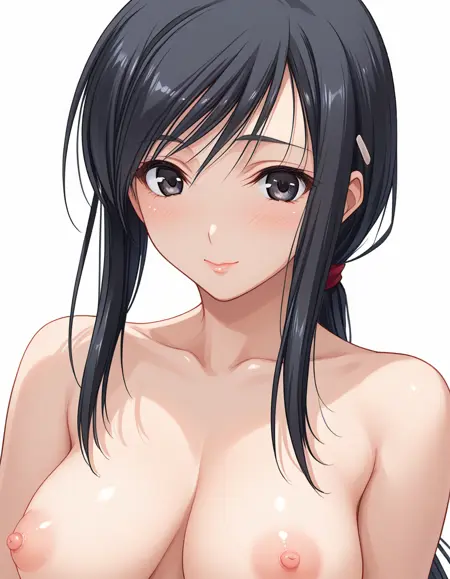hiiragi ayako, black hair, long hair, low ponytail, sidelocks, black eyes