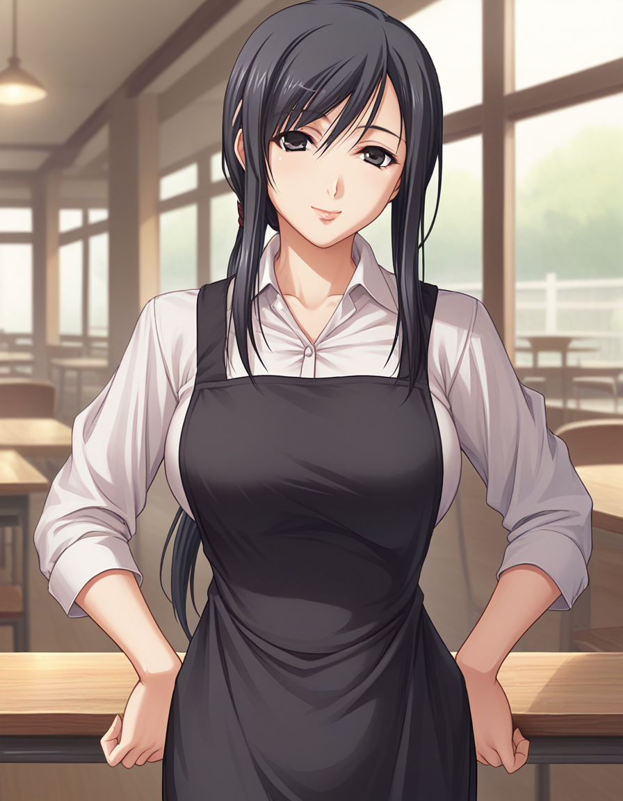 white shirt, collared shirt, black apron, pencil skirt, medium skirt