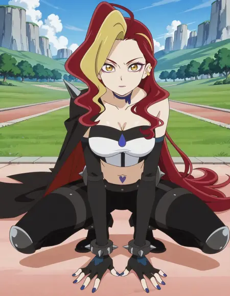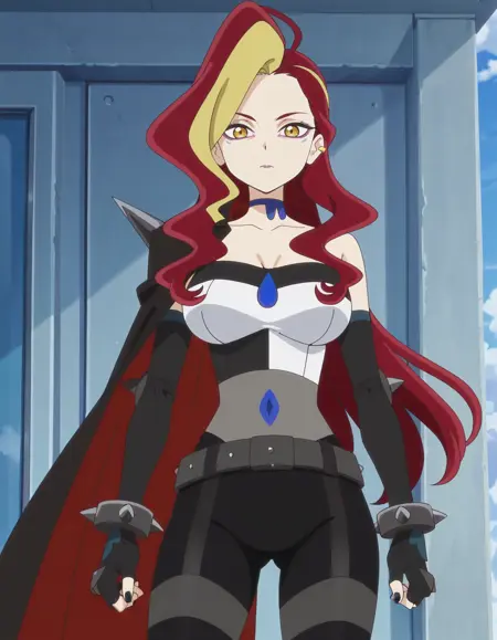 score_9, score_8_up, score_7_up, anime screencap,1girl, solo, gloves, red hair,multicolored hair, spikes, fingerless gloves, yellow eyes, long hair, spiked bracelet, cape, jewelry, bracelet, piercing, makeup, choker, eyeshadow, elbow gloves, belt, black gloves, lora:kaiserin:0.8