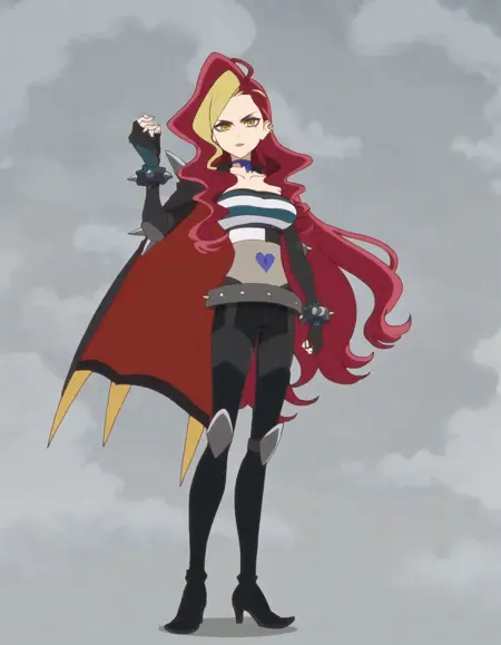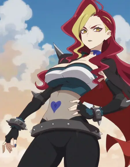 score_9, score_8_up, score_7_up, anime screencap, 1girl, solo, gloves, red hair, multicolored hair, spikes, fingerless gloves, yellow eyes, long hair, spiked bracelet, cape, jewelry, bracelet, piercing, makeup, choker, eyeshadow, elbow gloves, belt, black gloves, lora:kaiserin:0.8
