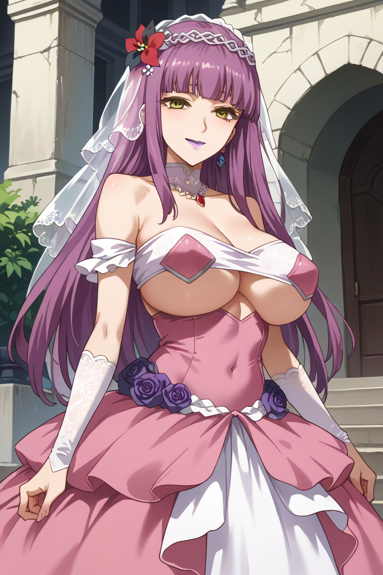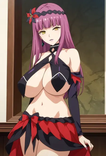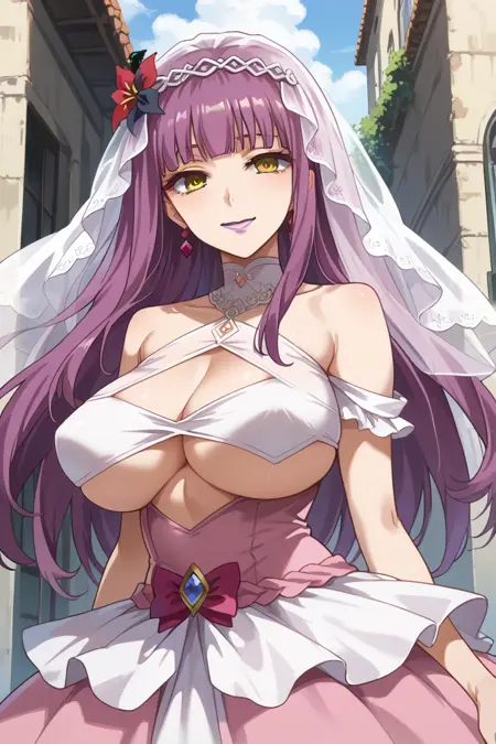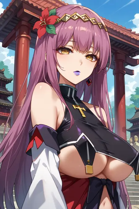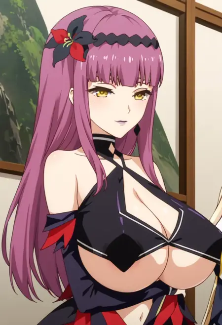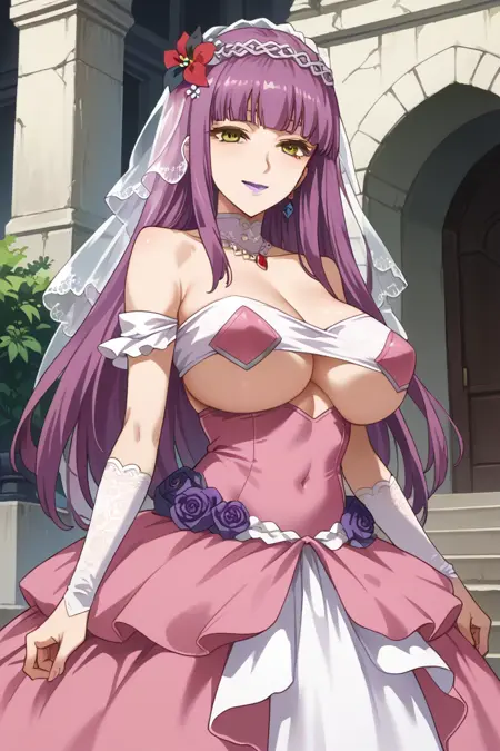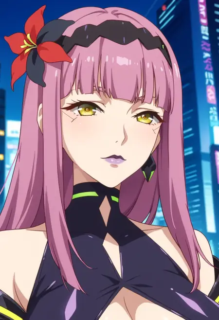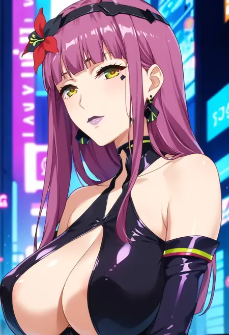 Lady J,紫色头发,长发,黄眼睛,发饰,发花,紫色嘴唇,口红,妆容,大乳房,