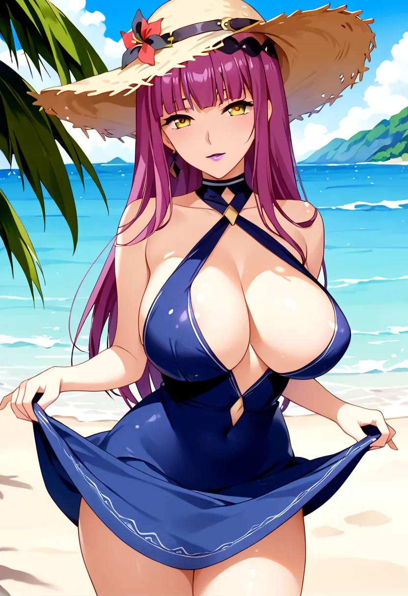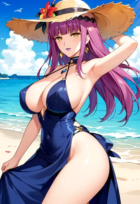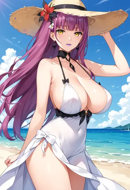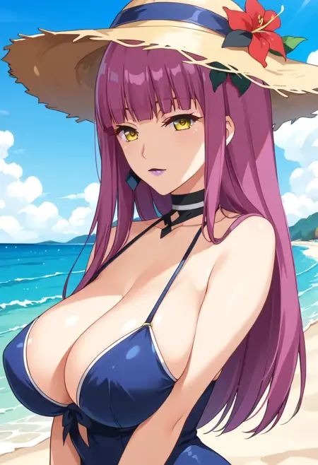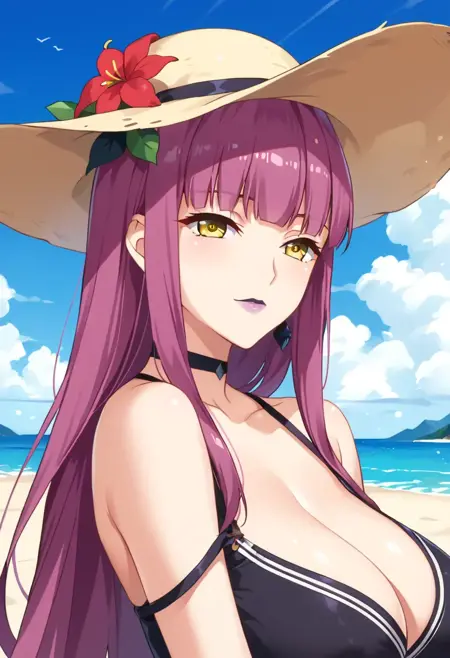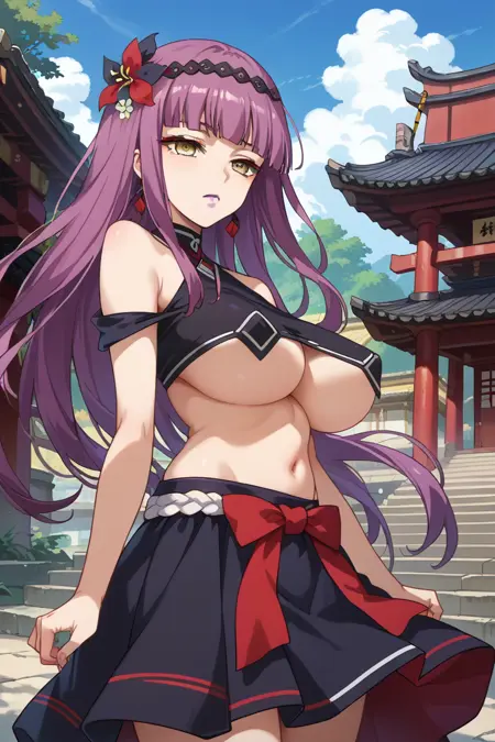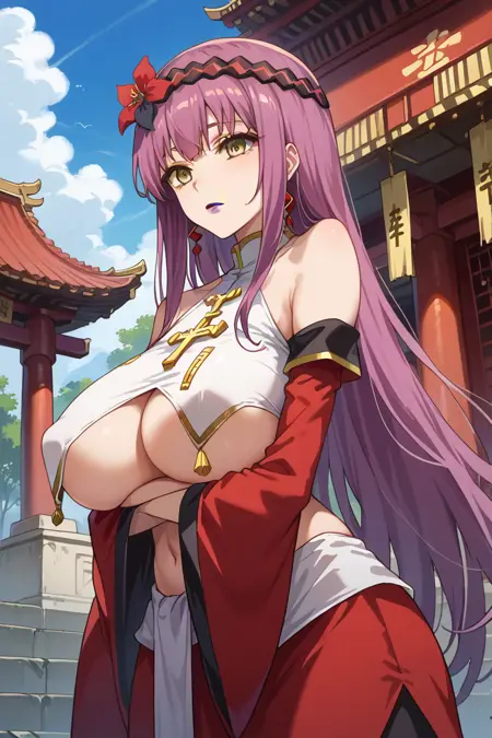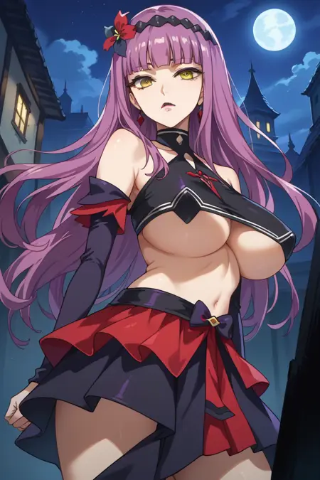 Lady J,紫色头发,长发,黄眼睛,发饰,发花,紫色嘴唇,口红,妆容,大乳房,