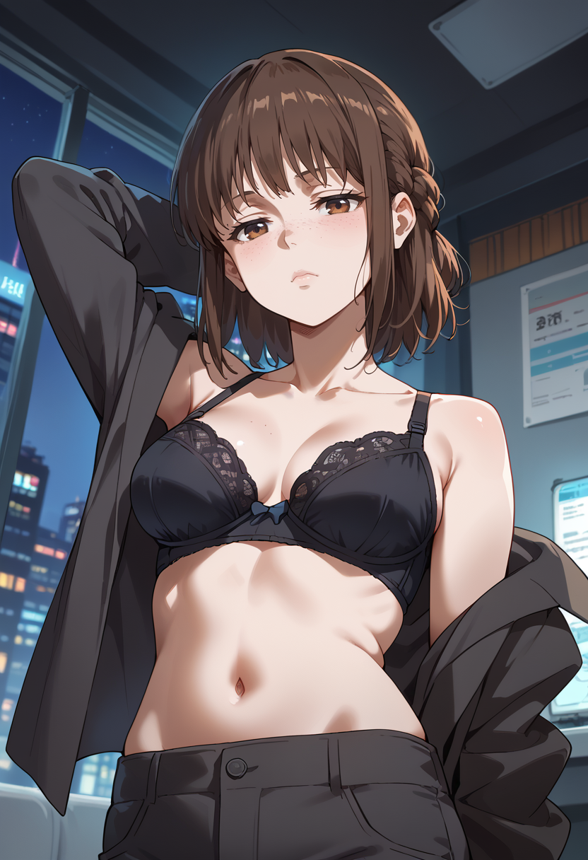 brown hair, brown eyes, medium hair, bangs, braid, freckles