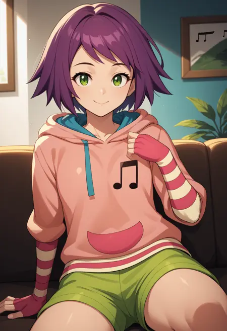 デフォルトの服装: 縞模様の服, ピンクのフーディー, フードをかぶっている, 音符, 指なし手袋, 縞模様の手袋, 緑のショートパンツ