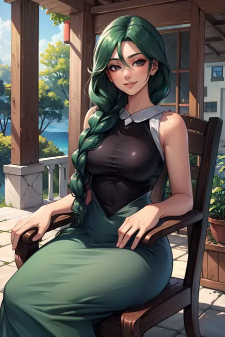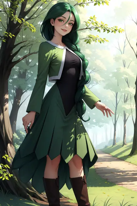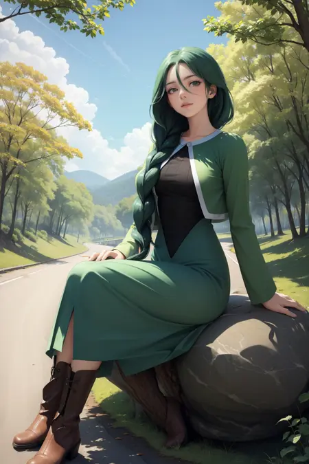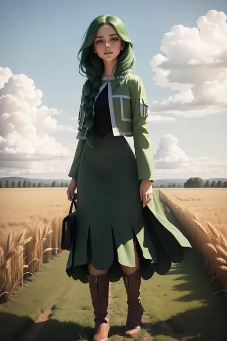 일반적인 모습을 원하신다면 "싱글 브레이드, 어깨 위로 머리 한 옆으로 나온 모습, 녹색 자켓, 긴 드레스, 부츠"를 추가하세요.