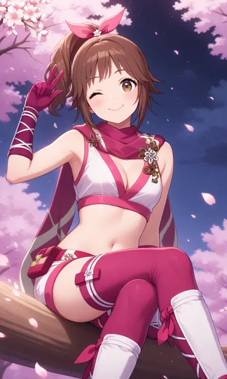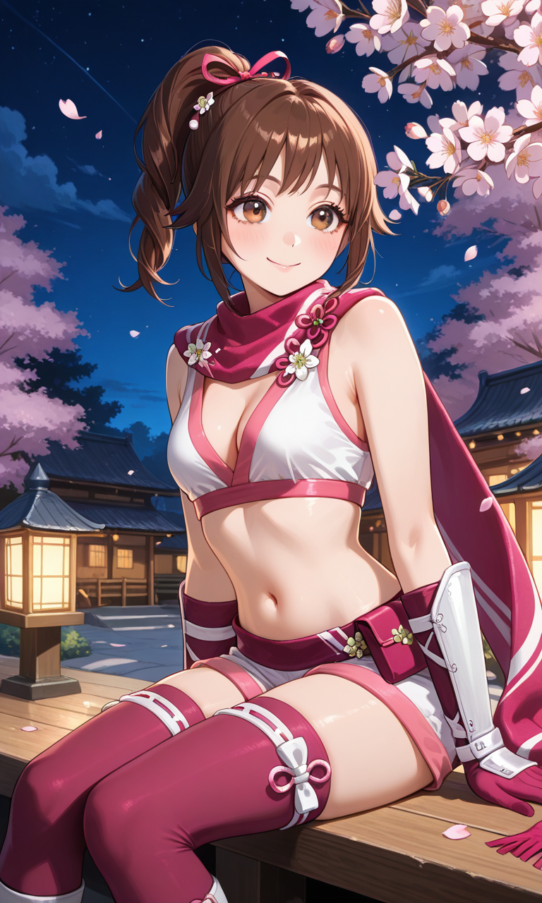 Kunoichi, brown hair, ponytail, hair ribbon, pink ribbons, brown eyes, pink scarf, midriff, navel, cleavage, white crop top, pink gloves, white bracers, white shorts, white shin guards, pink thigh highs, toeless sandals, bare shoulder