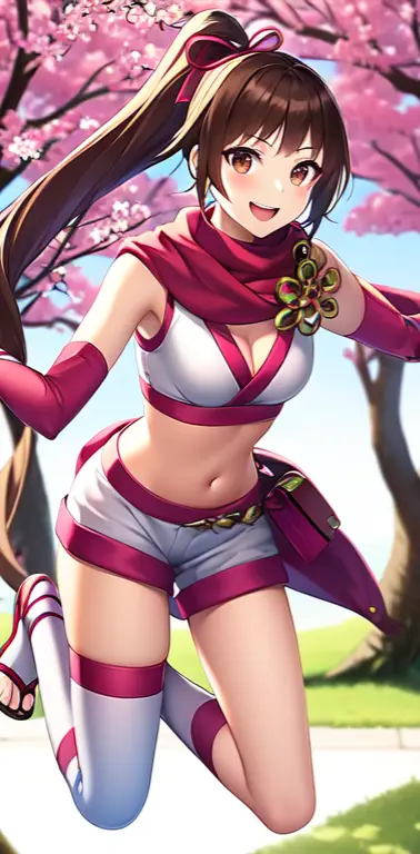 Kunoichi, brown hair, ponytail, hair ribbon, pink ribbons, brown eyes, pink scarf, midriff, navel, cleavage, white crop top, pink gloves, white bracers, white shorts, white shin guards, pink thigh highs, toeless sandals