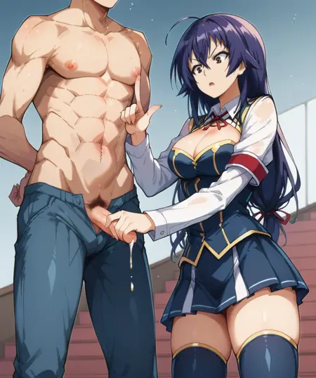 stnihj, (nipple_stimulation:1.2), femdom, standing, arms behind back, 1boy, penis, clothed female nude male,(cum:1.4), (cumdrip:1.5)