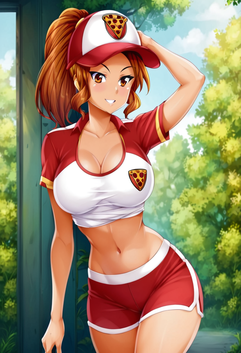 Event outfit does not work very well. If you really want to try use these tags: BCShannon, BCShannonPizza, brown hair, brown eyes, ponytail, long hair, large breasts, hat, baseball cap, short sleeves, red clothes