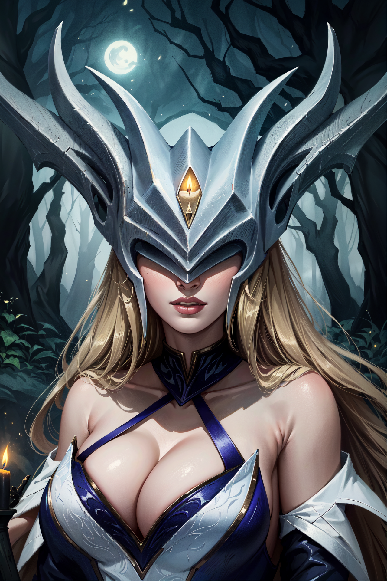 可选标签:头盔,白色连衣裙,脱掉的袖子,金色头发,头盔遮住眼睛,遮住眼睛,