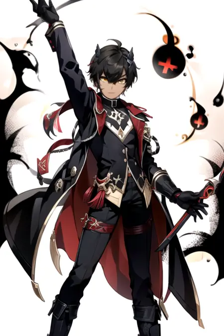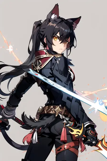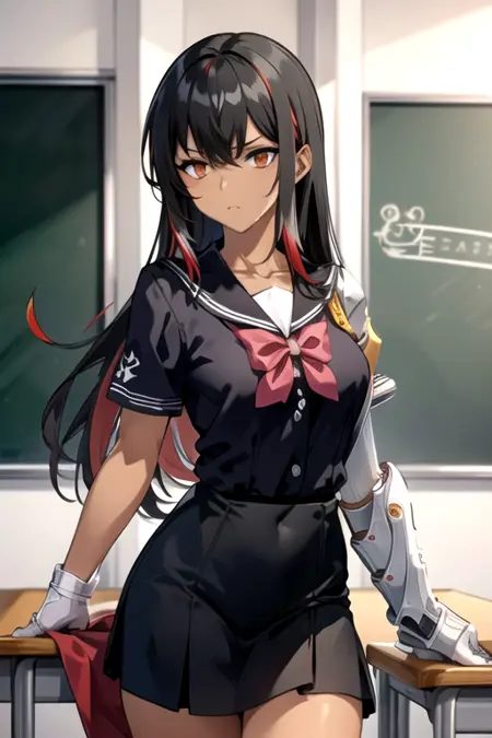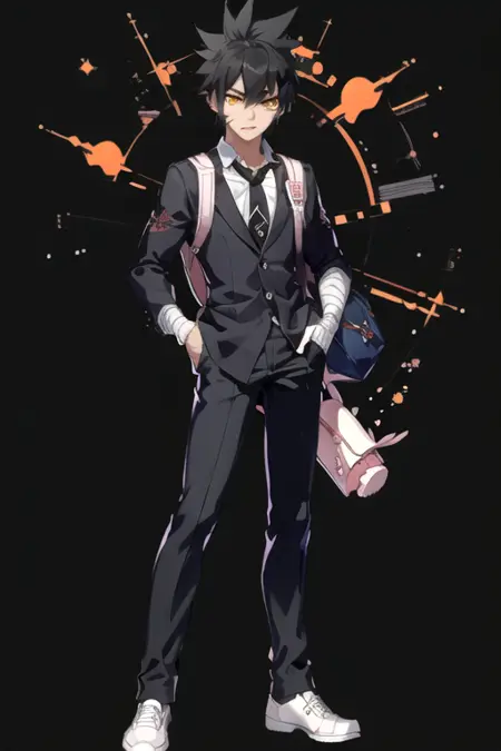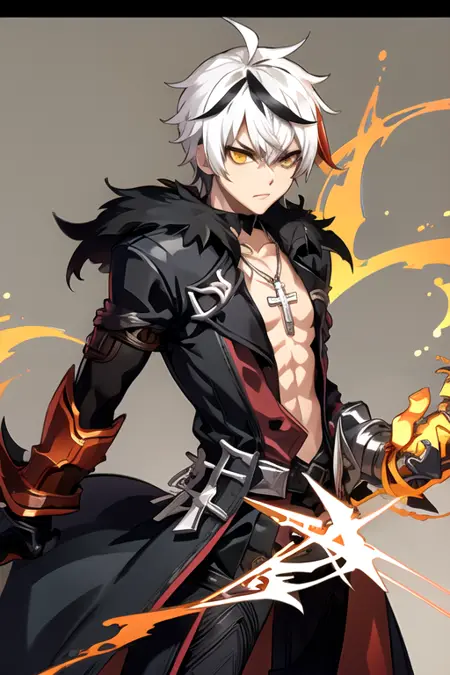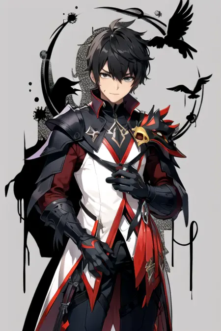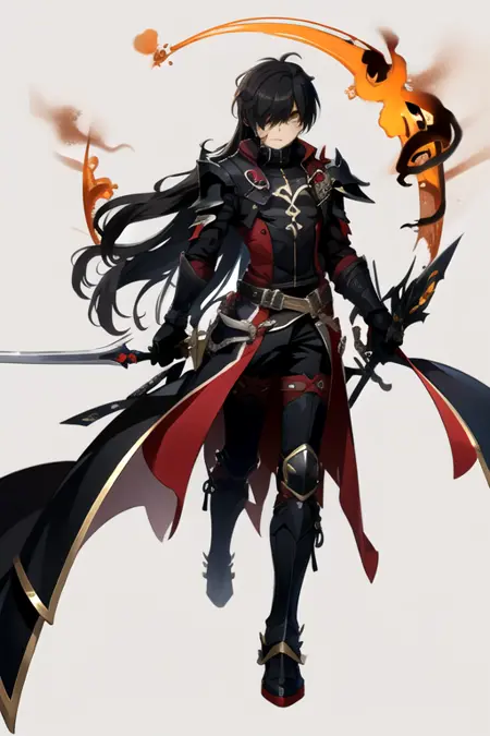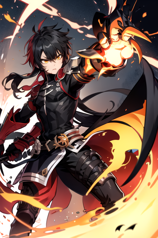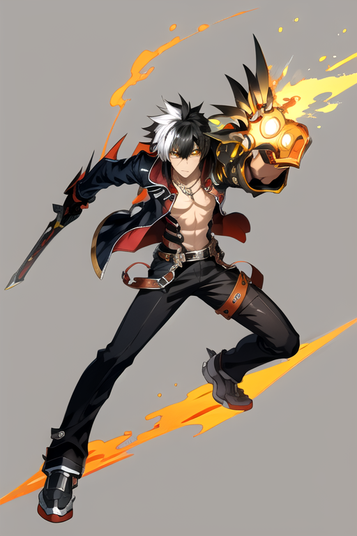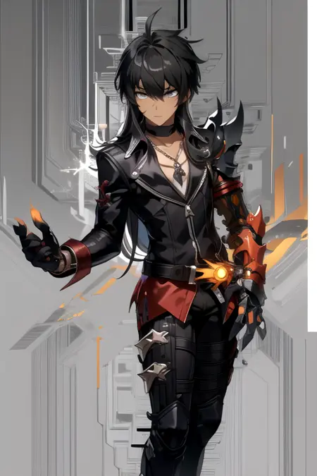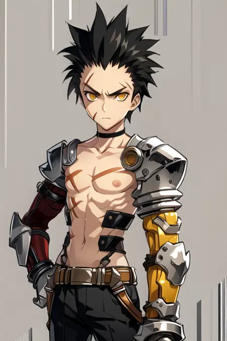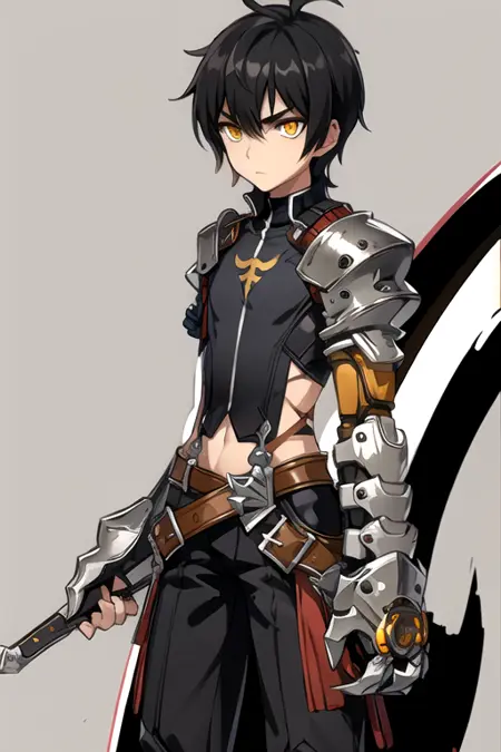 ravenc, 1boy, solo, black hair, yellow eyes, single mechanical arm, mechanical arms