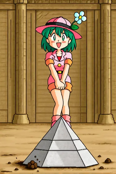 여자 조수, 주요 의상, 단발, 분홍색 모자, (초록색 머리, 초록색 눈, 분홍색 반바지, 갈색 신발이 필요할 수 있음)