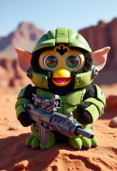 - (SUBJECT/OBJECT) の姿をしたFurbyのぬいぐるみの写真、(LOCATION)で。