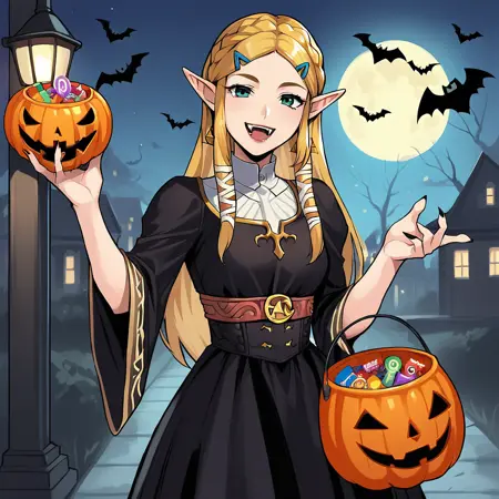 オプション:ハロウィンバケツ、観察者を見つめる、持っている、キャンディー、屋外、玄関、夜、月