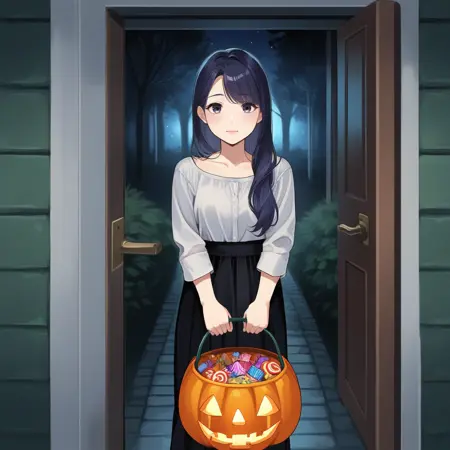 可选:万圣节南瓜桶、看向观众、手持、糖果、户外、门廊、夜晚、月亮