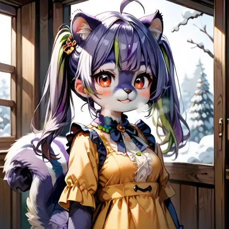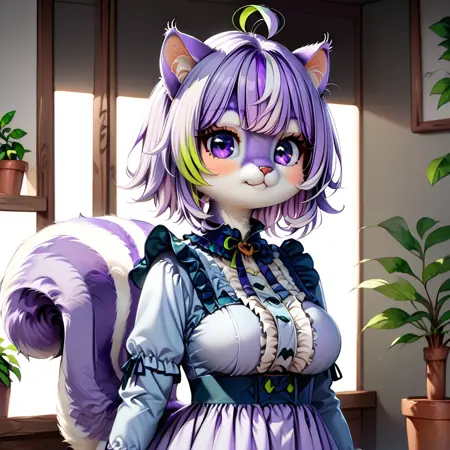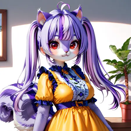 프롬프트: Mauveko, anthro, feral, furry, squirrel female, purple hair, twintails, green highlights, ahoge, red eyes,