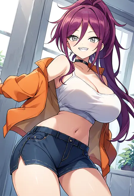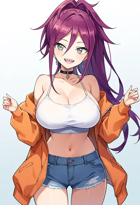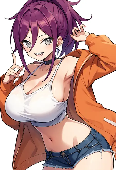 유리 쿠렌아시, 회색 눈, 빨간 머리카락, 높은 토대머리, 측면 머리카락, 눈 사이의 머리카락, 거대한 가슴, 날카로운 이빨,
