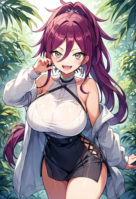 Yuri Kurenashi, grey eyes, red hair, high ponytail, sidelocks, hair between eyes, huge breasts, sharp teeth,