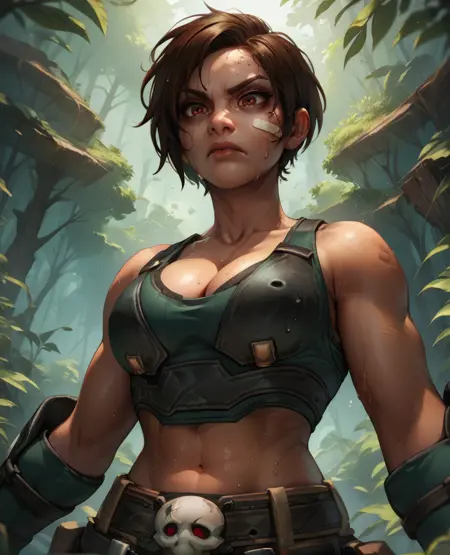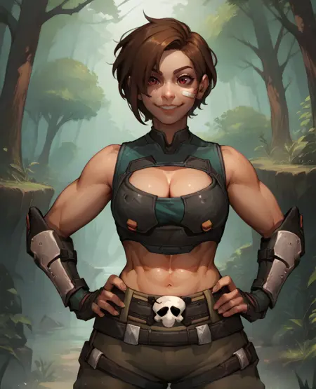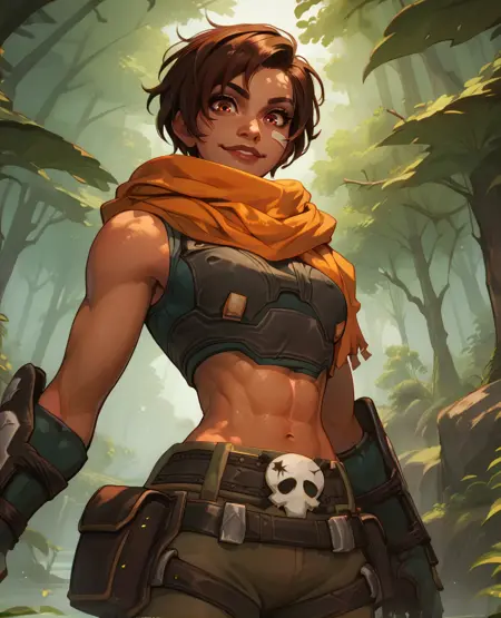 주황색 스카프, 팔보호대, 뼈 장식이 있는 벨트 또는 벨트 — 크롭탑 또는 초록색 탑, 복부 노출 또는 배꼽 노출 — 바지, 부츠,