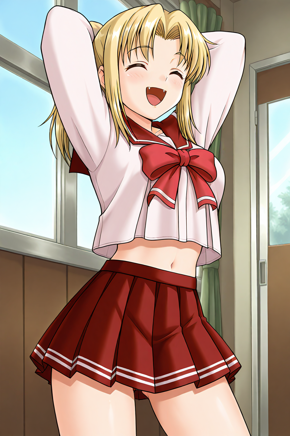 school uniform,serafuku,shirt,pink shirt,long sleeves,bow,bowtie,red bow,midriff,skirt,pleated skirt,red skirt,
