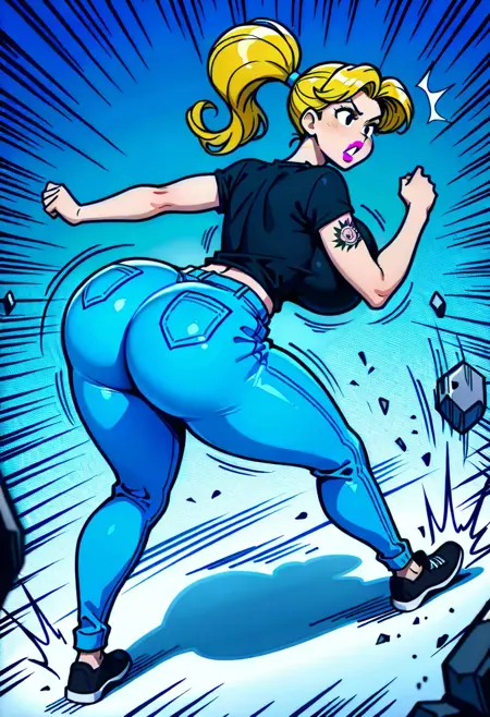 XabeuTDM, 1girl, blonde hair, ponytail, black shirt, blue pants, tattoo on arm, black eyes, pink lips, lipstick, black shoes,