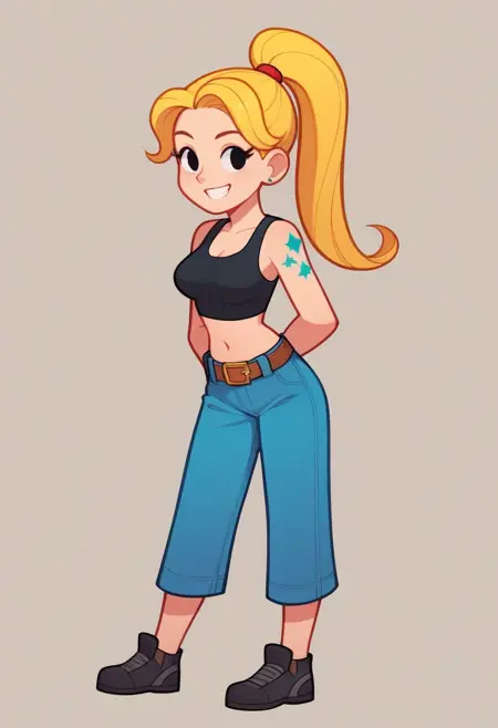 zabeu, 1girl, long hair, blonde hair, navel, medium breasts, ponytail, pants, belt, midriff, grin, crop top, tattoo, tank top, black eyes